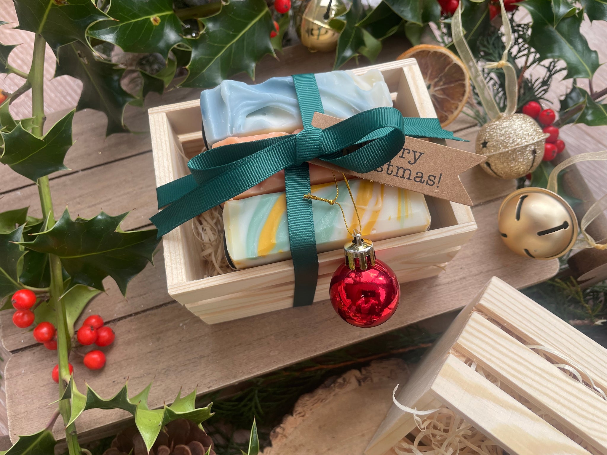Natural, handmade soap bars in a wooden crate with Christmas ribbon, tag and bauble.